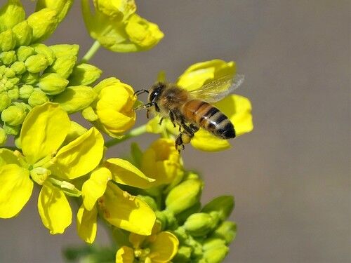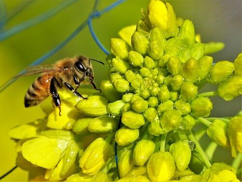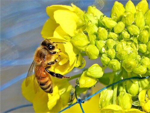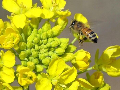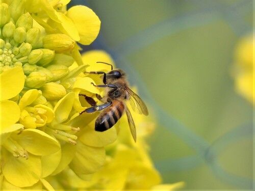 菜の花とセイヨウミツバチ:暖かい日はミツバチが働いています
