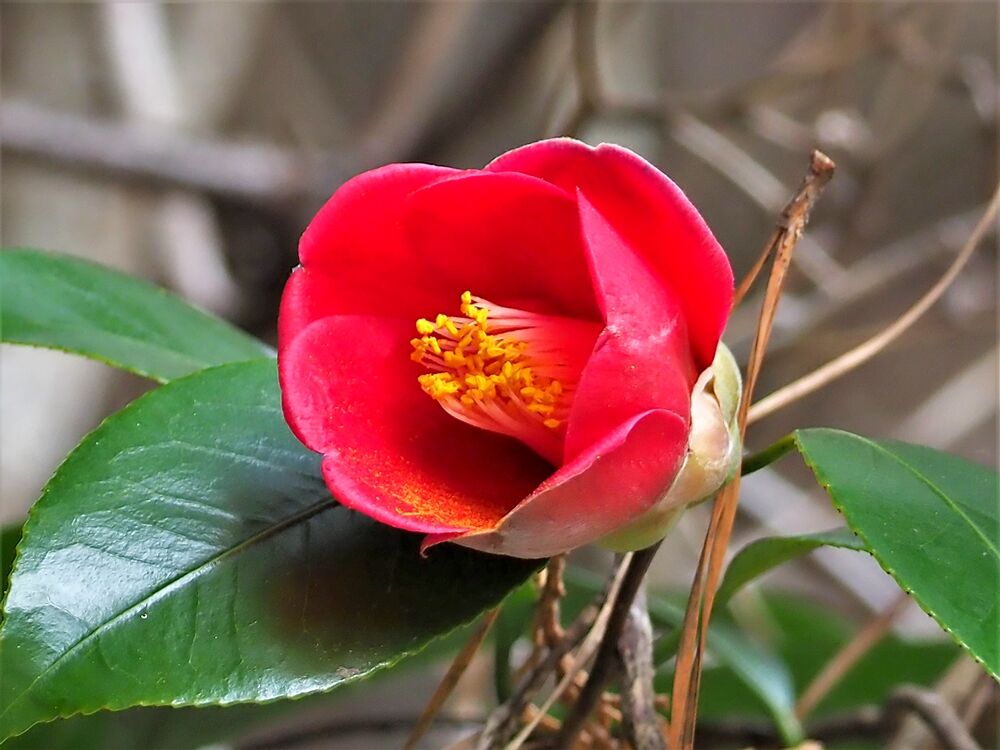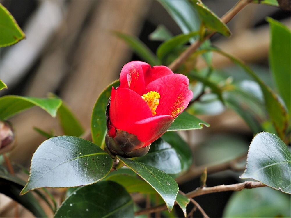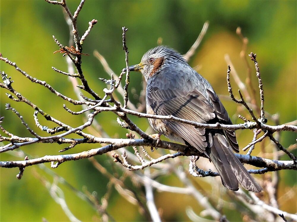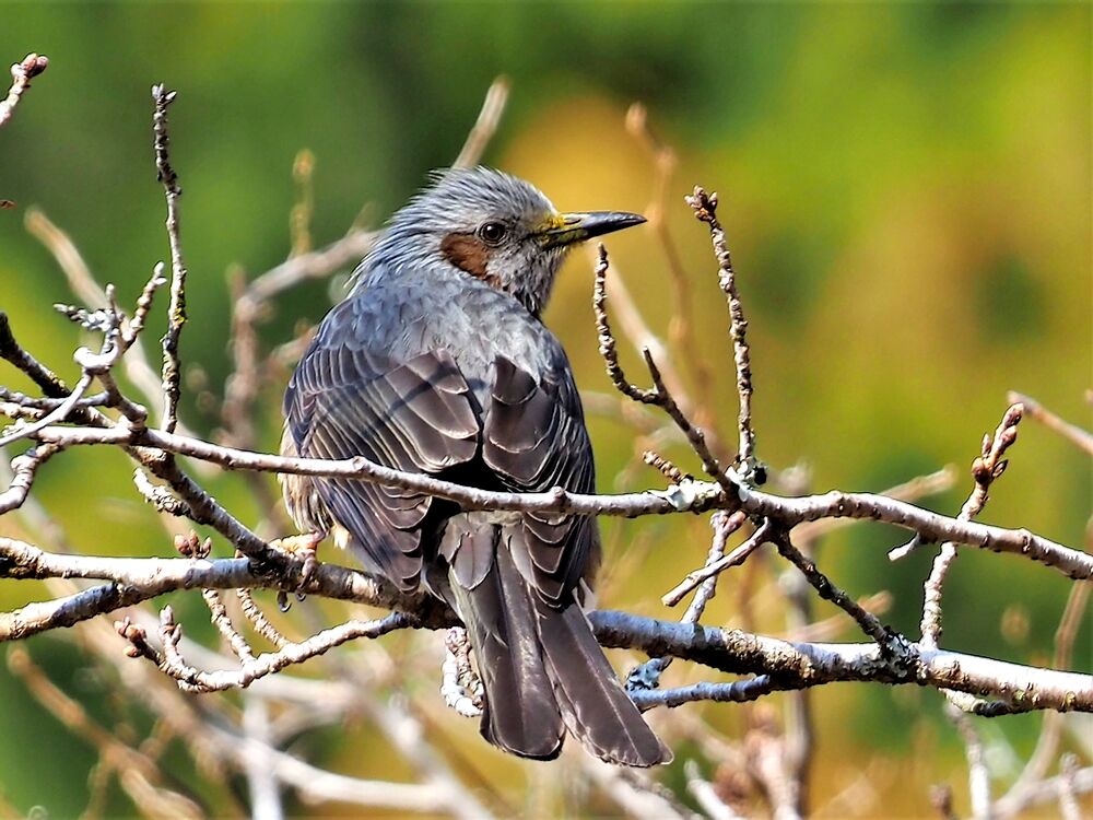 ヒヨドリ:ヤブツバキに顔を突っ込み蜜を食べるのでクチバシ周辺が黄色