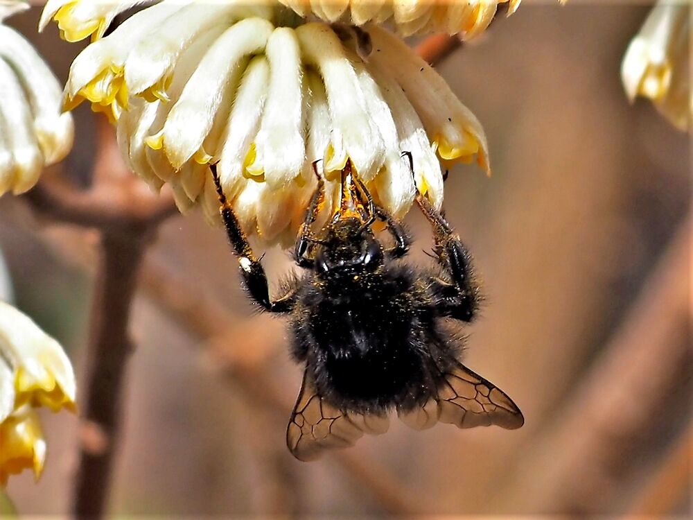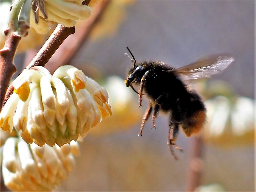 クロマルハナバチ:少し大きめのハナバチ、花はミツマタです