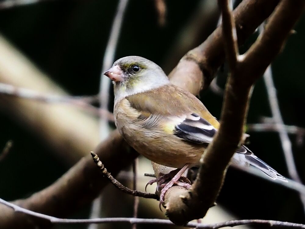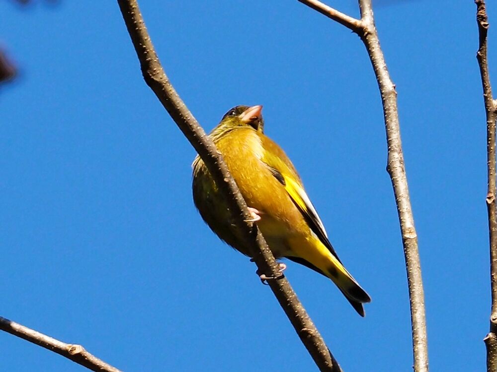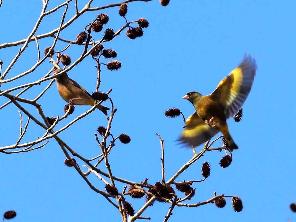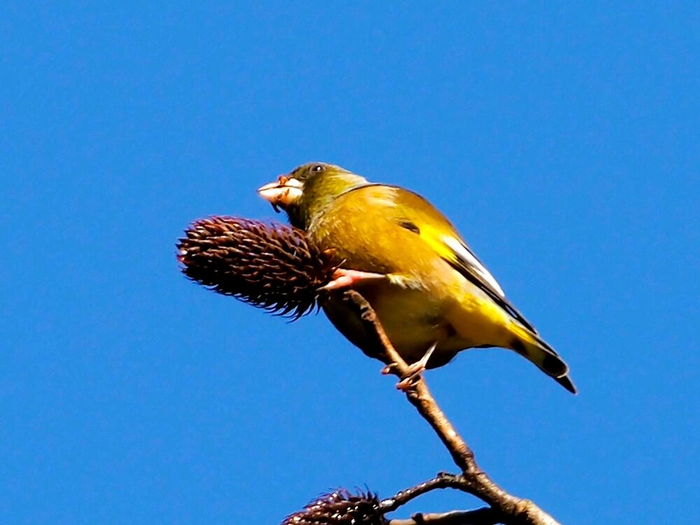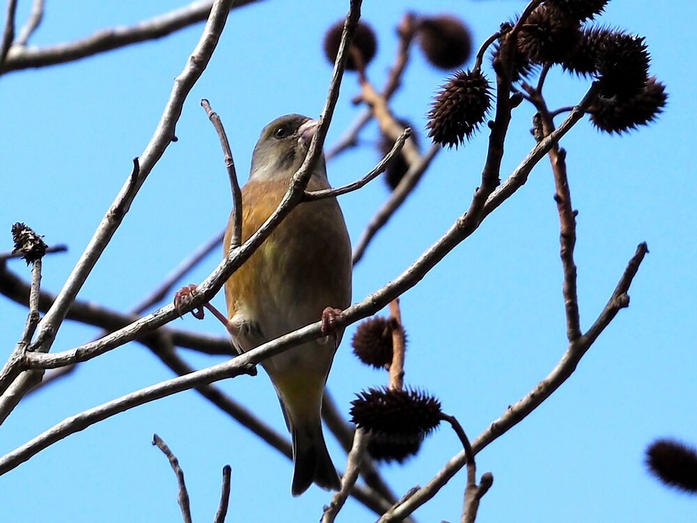 カワラヒワ:ノグルミの木の頂上で種を食べてた